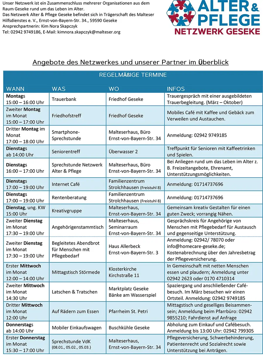 Geseke – Mitglieder sind unter anderem Pflegedienstleister, die Kirche, die Malteser, das Krankenhaus, Ärzte und der Seniorenbeirat. Das Netzwerk will „vielfältige Kompetenzen und Erfahrungen rund um das Leben im Alter“ vereinen, heißt es auf der Internetseite. Schwerpunkte sind etwa die medizinische und pflegerische Versorgung, aber auch Wohnen und Freizeitgestaltung.